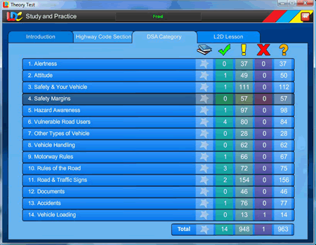 • Unique traffic light progress monitoring detailing which of the Official questions have been answered correctly, incorrectly or not at all. The only product to make Theory Testit easy to know when all the Official questions have been learnt or what is outstanding.